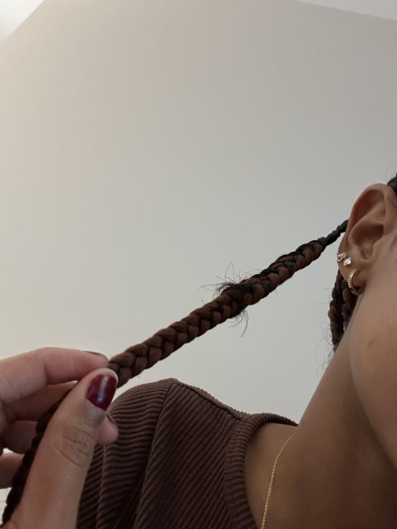 Freshly done braids with already-fuzzy edges signal poor installation technique. The flyaways and frizz around the hairline create a messy first impression.