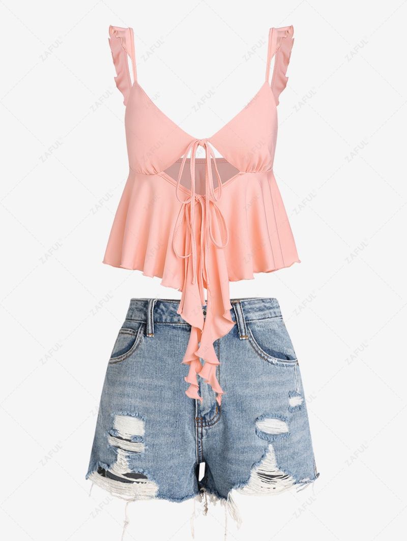 Feminine ruffles add movement and dimension to a basic tank. Paired with denim bermuda shorts, you’ll stay cool while maintaining a put-together appearance.