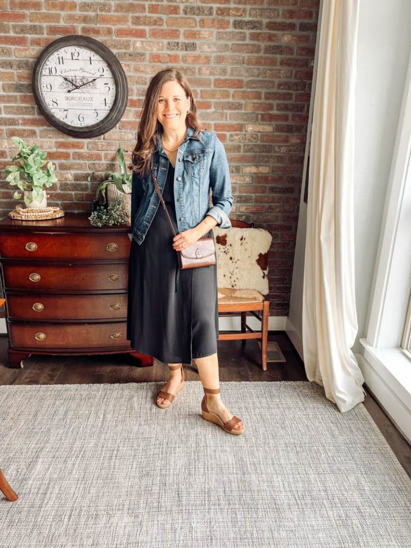 If you’ve shied away from maxis, try this pairing! The jacket defines your waistline while the dress provides comfort. Together they create visual interest that works for casual gatherings or evening events with equal success.