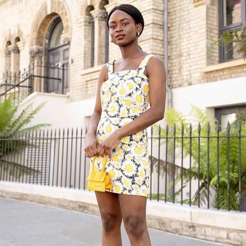 Darling, this dress makes me weak at the knees! Delicate daisies dance across a butter-yellow backdrop, creating the sweetest silhouette when you twirl.