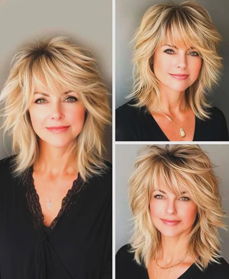 As franjas texturadas acrescentam um elemento divertido aos cortes em camadas. Realçam o estilo geral, proporcionando profundidade e carácter. Este look é perfeito para quem quer uma aparência fresca e jovem. É versátil e está na moda, o que o torna um favorito entre as mulheres que procuram algo novo.