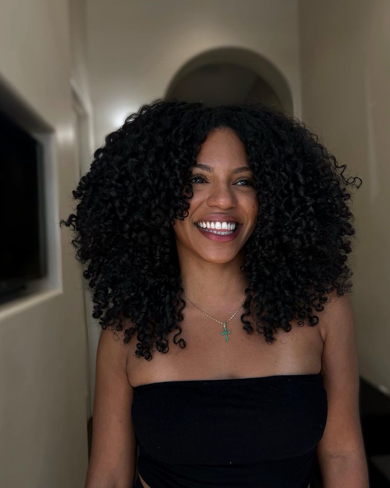 As camadas encaracoladas celebram os caracóis naturais ao mesmo tempo que acrescentam estrutura. Realçam a elasticidade e o volume naturais do seu cabelo, tornando-as perfeitas para rostos mais cheios. Este estilo permite-lhe abraçar a sua textura natural com confiança.