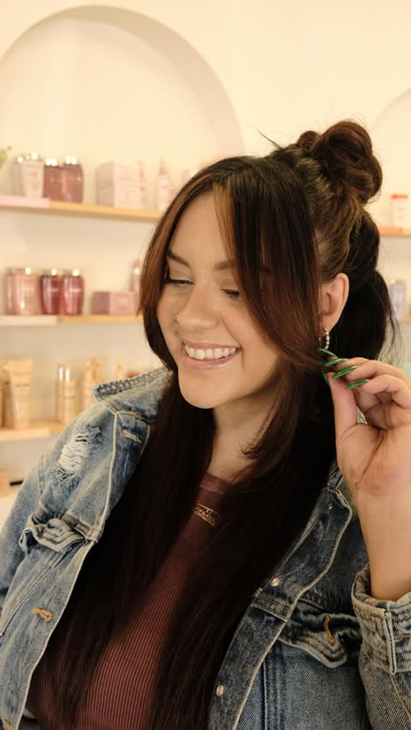 As camadas com franja dão um toque divertido ao seu penteado. A franja emoldura o rosto, dando um aspeto jovem e fresco. Este corte é perfeito para quem procura realçar os olhos e as maçãs do rosto.